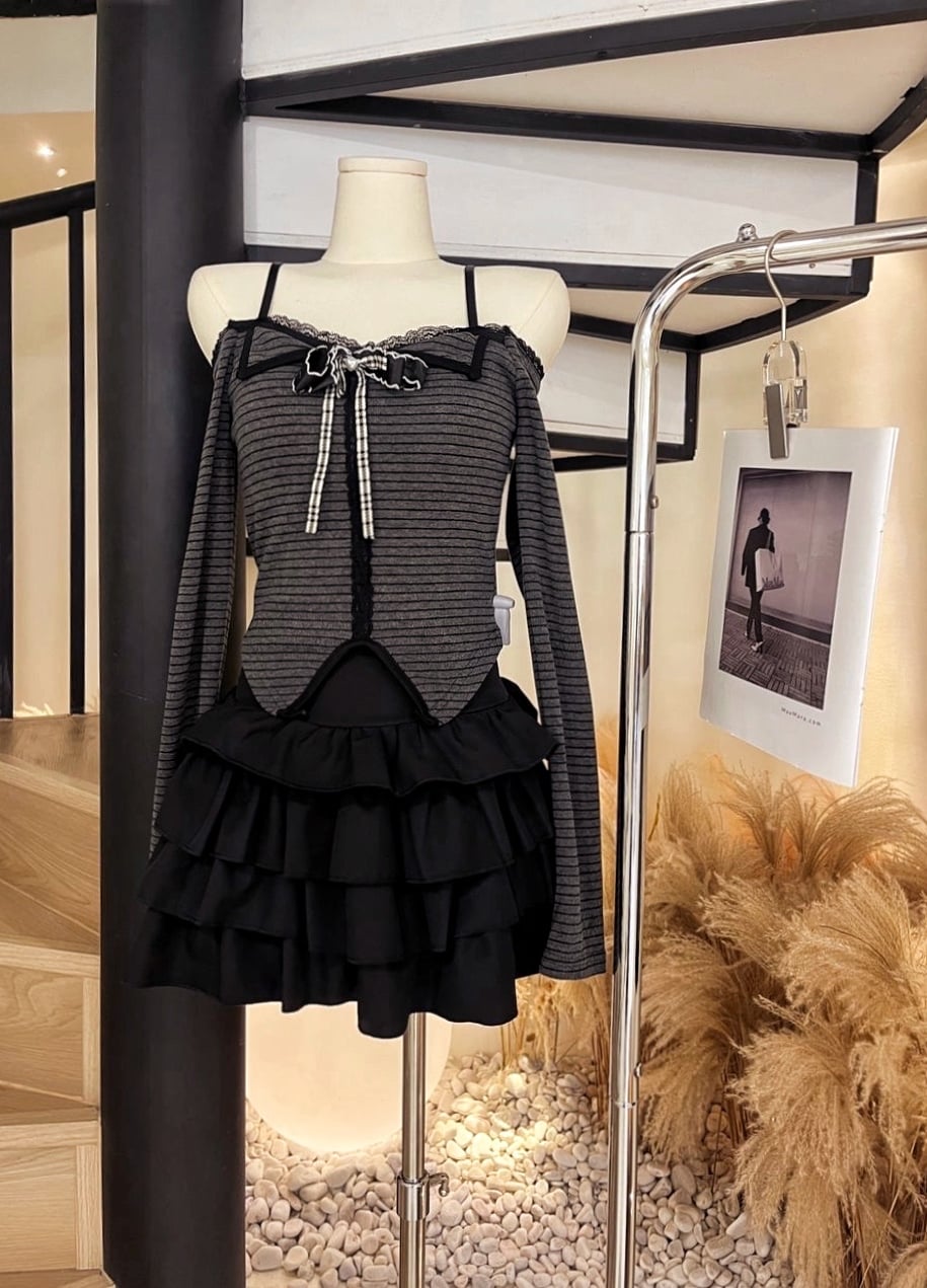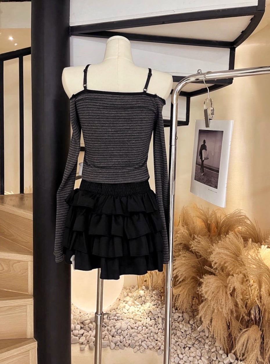 条纹胸垫上衣+蛋糕短裙
