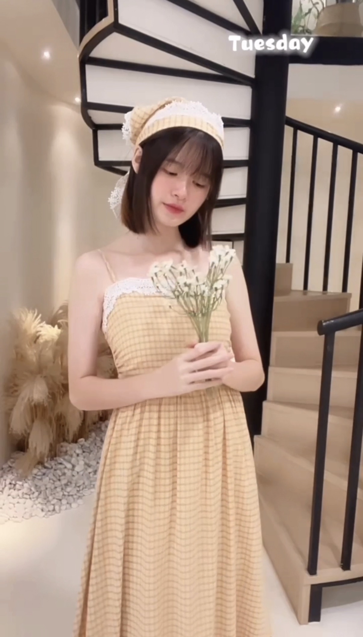 格子连身裙+腰巾